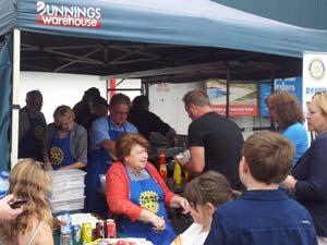 The day begins around 8am. Usually, two or three Rotarians who are not necessarily able to stay for a full shift attend before work to help erect the covered BBQ and do the basic setting up. Setting up consists of preparing the BBQ plate, setting out the sales area with condiments and metal containers for completed orders. Cans of drinks and bottles of water are placed into large plastic containers together with plenty of ice. A couple of large refuse bags are placed in position.